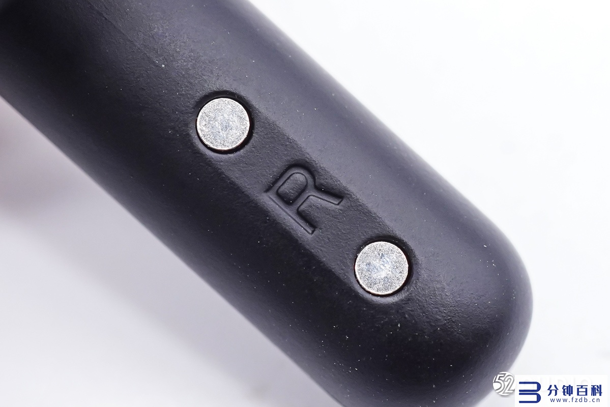 为耳机充电的金属触点特写,中间雕刻有l/r左右标识,便于用户快速区分。
