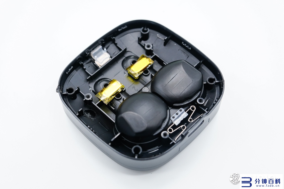 撬开充电盒外壳,腔体内部结构一览,后盖固定有电池单元,通过导线连接到座舱上的主板。