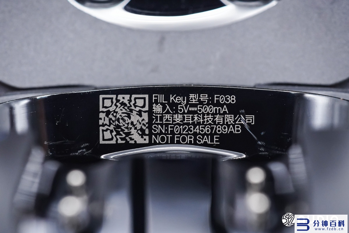 充电盒顶部圆形fiil品牌logo装饰特写。